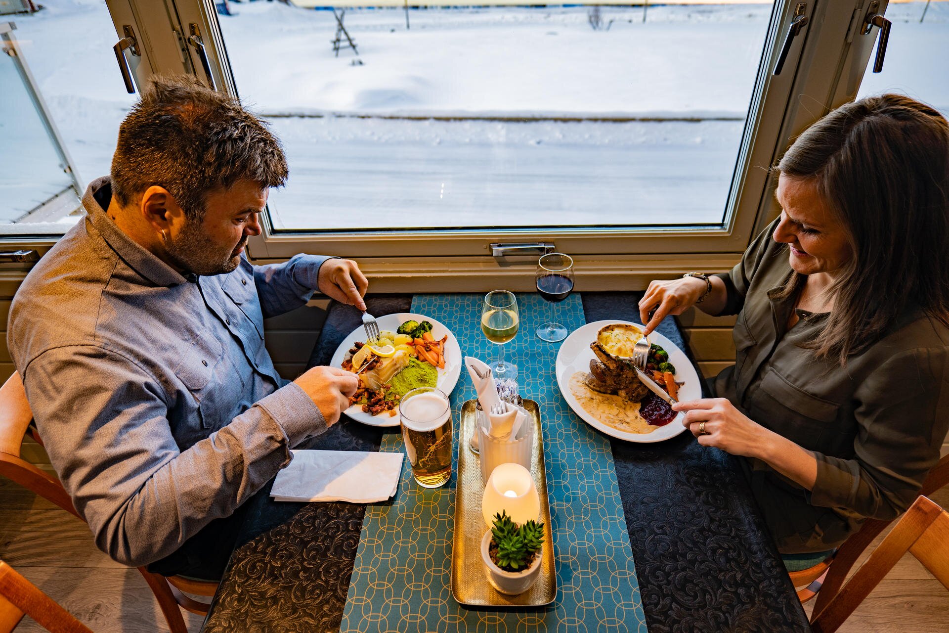 Vår mat er en hyllest til de fantastiske råvarene vi høster til havs og til fjells. Kongekrabbe, torsk, kveite og reinkjøtt er vanlige hovedkomponenter. Disse kompletteres av tilbehør og desserter med multer, blåbær, tyttebær og lokale melkevarer.